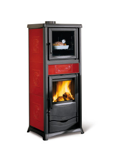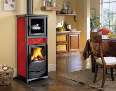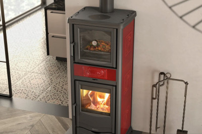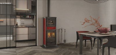 s dvojím spalováním, s keramickým obkladem v barvě bordo a navíc s pečící troubou v horní části !